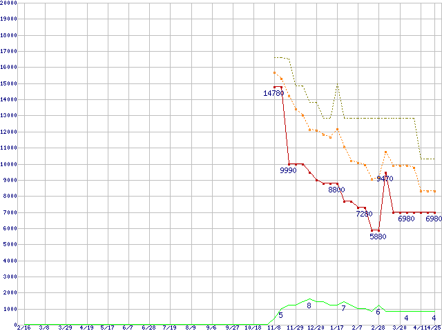※このグラフは過去のデータも税率5%相当に調整した税込み相当額のグラフです。 税率変更や、総額表示方式導入(2004年4月)の影響は除いています。 | | | ●凡例 | 最安値 (点線部は販売店未確認 または未調査) | 平均値 | 最高値 | ショップ数 |