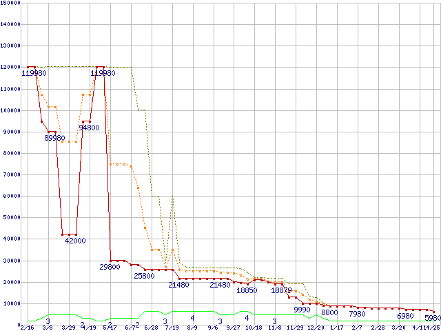 ※このグラフは過去のデータも税率5%相当に調整した税込み相当額のグラフです。 税率変更や、総額表示方式導入(2004年4月)の影響は除いています。 | | | ●凡例 | 最安値 (点線部は販売店未確認 または未調査) | 平均値 | 最高値 | ショップ数 |