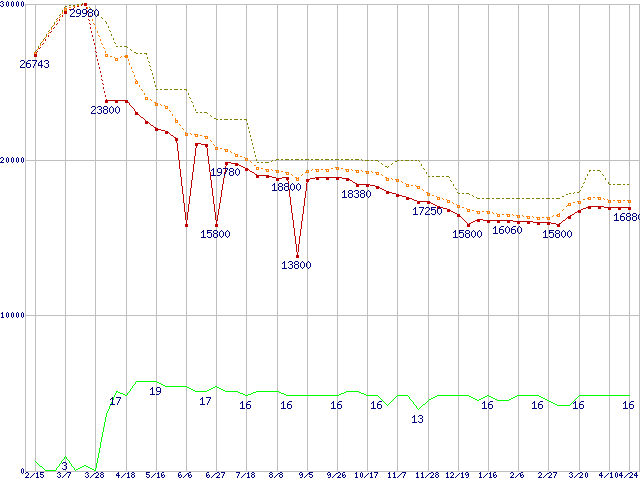 | Core 2 Duo E8400 (3GHz,L2 6MB)の価格推移 | | | (2008年2月15日~2009年4月24日) |