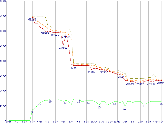 ※このグラフは過去のデータも税率5%相当に調整した税込み相当額のグラフです。 税率変更や、総額表示方式導入(2004年4月)の影響は除いています。 | | | ●凡例 | 最安値 (点線部は販売店未確認 または未調査) | 平均値 | 最高値 | ショップ数 |