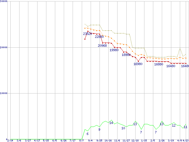※このグラフは過去のデータも税率5%相当に調整した税込み相当額のグラフです。 税率変更や、総額表示方式導入(2004年4月)の影響は除いています。 | | | ●凡例 | 最安値 (点線部は販売店未確認 または未調査) | 平均値 | 最高値 | ショップ数 |