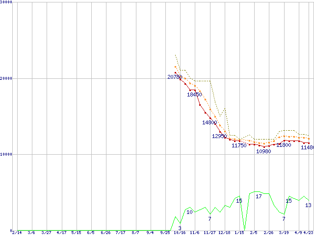 ※このグラフは過去のデータも税率5%相当に調整した税込み相当額のグラフです。 税率変更や、総額表示方式導入(2004年4月)の影響は除いています。 | | | ●凡例 | 最安値 (点線部は販売店未確認 または未調査) | 平均値 | 最高値 | ショップ数 |