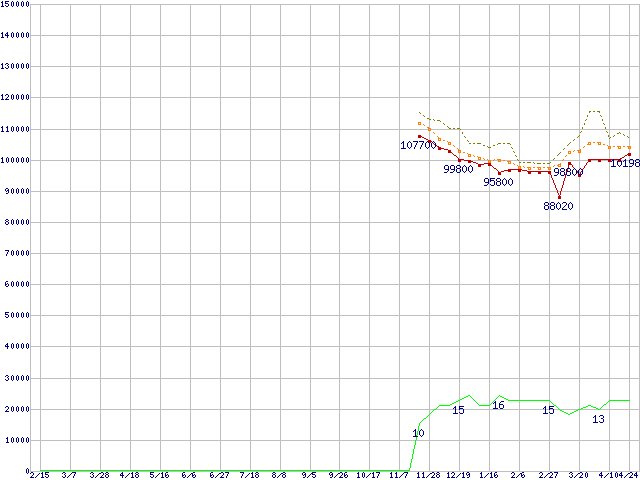 ※このグラフは過去のデータも税率5%相当に調整した税込み相当額のグラフです。 税率変更や、総額表示方式導入(2004年4月)の影響は除いています。 | | | ●凡例 | 最安値 (点線部は販売店未確認 または未調査) | 平均値 | 最高値 | ショップ数 |