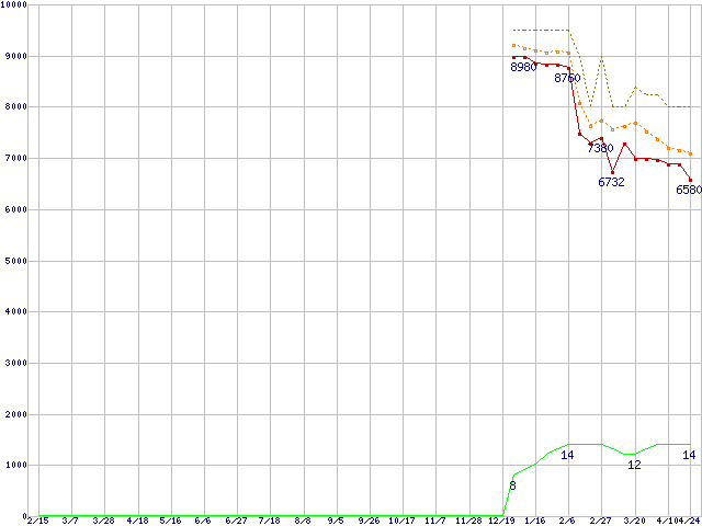 | Athlon X2 7750 Black Edition (2.7GHz,L2 512KB×2,L3 2MB)の価格推移 | | | (2008年2月15日~2009年4月24日) |