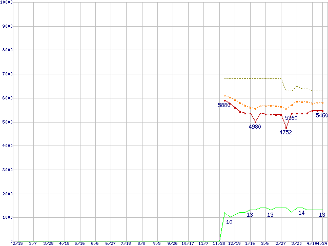 ※このグラフは過去のデータも税率5%相当に調整した税込み相当額のグラフです。 税率変更や、総額表示方式導入(2004年4月)の影響は除いています。 | | | ●凡例 | 最安値 (点線部は販売店未確認 または未調査) | 平均値 | 最高値 | ショップ数 |