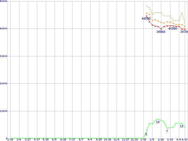 ※このグラフは過去のデータも税率5%相当に調整した税込み相当額のグラフです。 税率変更や、総額表示方式導入(2004年4月)の影響は除いています。 | | | ●凡例 | 最安値 (点線部は販売店未確認 または未調査) | 平均値 | 最高値 | ショップ数 |
