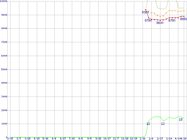 ※このグラフは過去のデータも税率5%相当に調整した税込み相当額のグラフです。 税率変更や、総額表示方式導入(2004年4月)の影響は除いています。 | | | ●凡例 | 最安値 (点線部は販売店未確認 または未調査) | 平均値 | 最高値 | ショップ数 |
