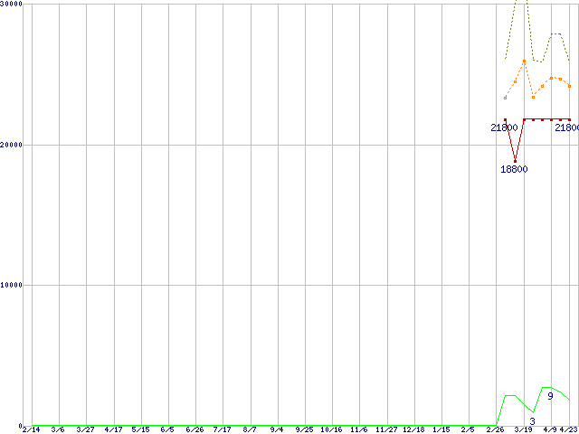 ※このグラフは過去のデータも税率5%相当に調整した税込み相当額のグラフです。 税率変更や、総額表示方式導入(2004年4月)の影響は除いています。 | | | ●凡例 | 最安値 (点線部は販売店未確認 または未調査) | 平均値 | 最高値 | ショップ数 |