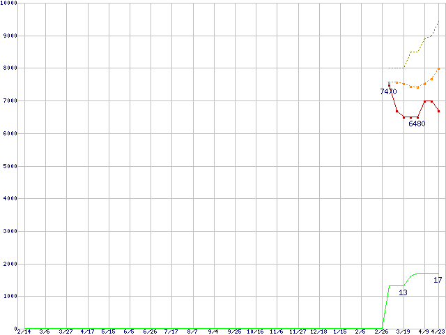 ※このグラフは過去のデータも税率5%相当に調整した税込み相当額のグラフです。 税率変更や、総額表示方式導入(2004年4月)の影響は除いています。 | | | ●凡例 | 最安値 (点線部は販売店未確認 または未調査) | 平均値 | 最高値 | ショップ数 |