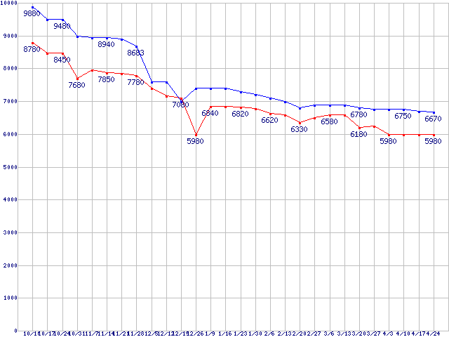 | Socket AM2 (HyperTransport,Dual Core,TDP 65W)の最安値推移 | | | (2008年10月10日~2009年4月24日) |