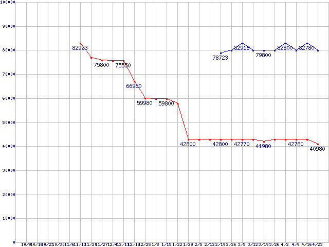 | X25-E Extreme SATA SSD (SSD,3Gb/s,2.5インチ,リード250MB/s・ライト170MB/s)の最安値推移 | | | (2008年10月9日~2009年4月23日) |