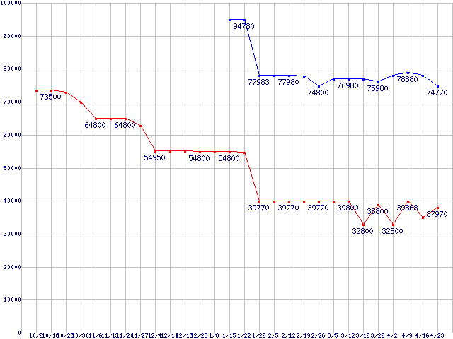 | X25-M Mainstream SATA SSD (SSD,3Gb/s,2.5インチ,リード250MB/s・ライト70MB/s)の最安値推移 | | | (2008年10月9日~2009年4月23日) |
