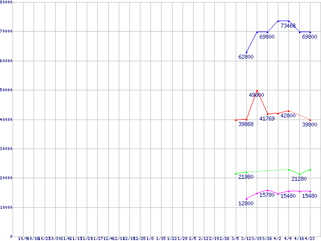 | OCZ Vertex Series SATA II 2.5" SSD (SSD,3Gb/s,2.5インチ,リード250~230MB/s・ライト180~135MB/s)の最安値推移 | | | (2008年10月9日~2009年4月23日) |