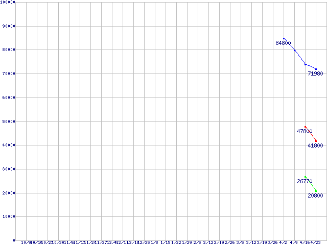 | PB22-J (SSD,3Gb/s,2.5インチ,リード220MB/s・ライト120~200MB/s)の最安値推移 | | | (2008年10月9日~2009年4月23日) |