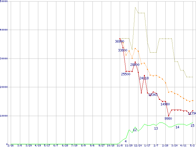 PC3-12800 2GB×3枚組みセットの価格推移↑前グラフ↓次グラフ(2008年2月16日〜2009年5月2日)※このグラフは過去のデータも税率5%相当に調整した税込み相当額のグラフです。 税率変更や、総額表示方式導入(2004年4月)の影響は除いています。●関連グラフメモリ主要製品の最安値推移メモリ主要製品(最安値1万円以上)の最安値推移PC3-12800(DDR3-1600) DDR3 SDRAM DIMMの最安値推移●凡例最安値(点線部は販売店未確認または未調査)平均値最高値ショップ数