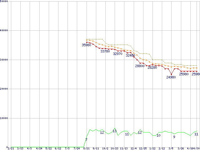 WD3000HLFS (300.0GB)の価格推移↑前グラフ↓次グラフ(2008年2月21日〜2009年4月30日)※このグラフは過去のデータも税率5%相当に調整した税込み相当額のグラフです。 税率変更や、総額表示方式導入(2004年4月)の影響は除いています。●関連グラフHDD/SSD主要製品の最安値推移HDD/SSD主要製品(最安値2万円以上)の最安値推移HDD 300〜400GB未満の最安値推移WD VelociRaptor (10000rpm,3Gb/s,16MB)の最安値推移●凡例最安値(点線部は販売店未確認または未調査)平均値最高値ショップ数