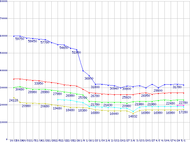 LGA1366 (QPI 4.8GT/s,L3キャッシュ8MB,Quad Core,Hyper-Threading)の最安値推移