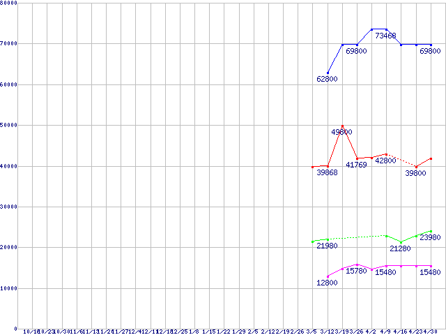 | OCZ Vertex Series SATA II 2.5" SSD (SSD,3Gb/s,2.5インチ,リード250~230MB/s・ライト180~135MB/s)の最安値推移 | | | (2008年10月16日~2009年4月30日) |