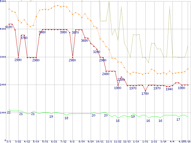 PC2-6400 1GB×2枚組みセットの価格推移↑前グラフ↓次グラフ(2008年3月1日〜2009年5月16日)※このグラフは過去のデータも税率5%相当に調整した税込み相当額のグラフです。 税率変更や、総額表示方式導入(2004年4月)の影響は除いています。●関連グラフメモリ主要製品の最安値推移1GBモジュールの最安値推移メモリ主要製品(最安値5千円未満)の最安値推移PC2-6400(DDR2-800) DDR2 SDRAM DIMMの最安値推移●凡例最安値(点線部は販売店未確認または未調査)平均値最高値ショップ数