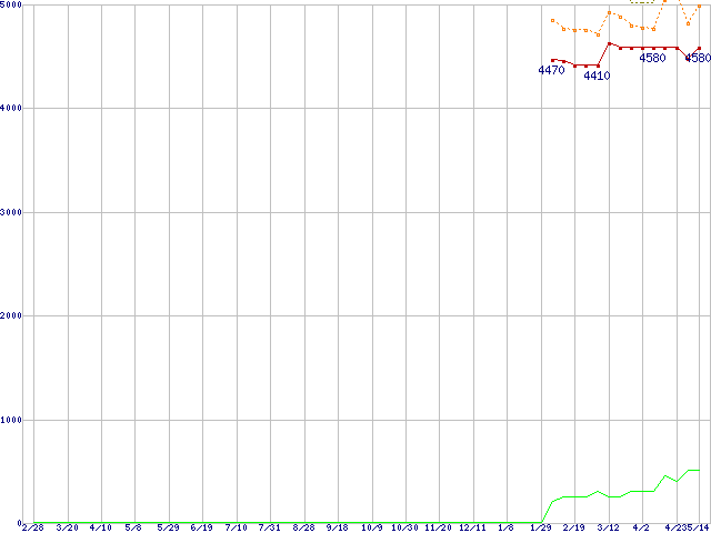 HD502HI (500GB,16MB)の価格推移↑前グラフ↓次グラフ(2008年2月28日〜2009年5月14日)※このグラフは過去のデータも税率5%相当に調整した税込み相当額のグラフです。 税率変更や、総額表示方式導入(2004年4月)の影響は除いています。●関連グラフHDD/SSD主要製品の最安値推移HDD/SSD主要製品(最安値1万円未満)の最安値推移HDD 500〜600GB未満の最安値推移EcoGreen F2 (5400rpm,3Gb/s)の最安値推移●凡例最安値(点線部は販売店未確認または未調査)平均値最高値ショップ数