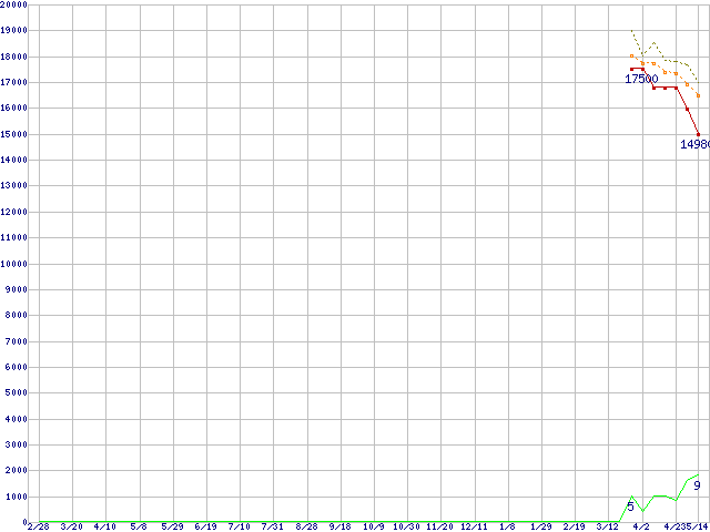 WD15EADS (1.5TB,32MB)の価格推移↑前グラフ↓次グラフ(2008年2月28日〜2009年5月14日)※このグラフは過去のデータも税率5%相当に調整した税込み相当額のグラフです。 税率変更や、総額表示方式導入(2004年4月)の影響は除いています。●関連グラフHDD/SSD主要製品の最安値推移HDD/SSD主要製品(最安値1万円〜1万5千円未満)の最安値推移HDD 1.5TB以上の最安値推移WD Caviar Green (3Gb/s)の最安値推移●凡例最安値(点線部は販売店未確認または未調査)平均値最高値ショップ数
