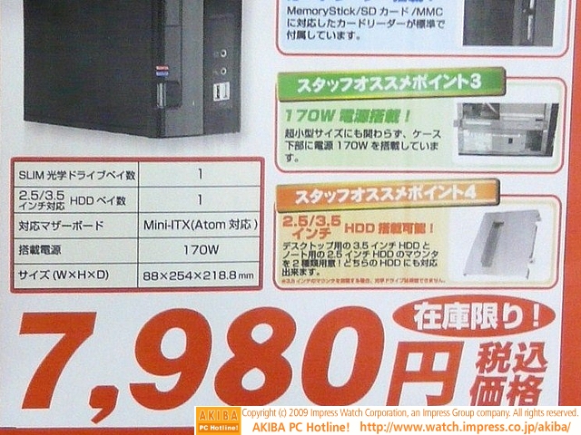 ![]() | AKIBA PC Hotline! 2009年5月16日号 液晶背面に取り付けられるMini-ITXケースが発売に、省スペース自作の新コンセプト? 今週見つけた新製品:ケース類/関連製品 ユニットコム UNI-ITX300/170W |