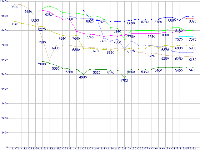 CPU主要製品(最安値1万円未満)の最安値推移↑前グラフ↓次グラフ(2008年11月7日〜2009年5月22日)※このグラフは過去のデータも税率5%相当に調整した税込み相当額のグラフです。 税率変更や、総額表示方式導入(2004年4月)の影響は除いています。凡例Pentium Dual-Core E5400 (2.7GHz,L2 2MB)Pentium Dual-Core E6300 (2.8GHz,L2 2MB)Phenom X3 8450e (2.1GHz,L2 512KB×3,L3 2MB)Pentium Dual-Core E5300 (2.6GHz,L2 2MB)Athlon X2 7850 Black Edition (2.8GHz,L2 512KB×2,L3 2MB)Pentium Dual-Core E5200 (2.5GHz,L2 2MB)Athlon X2 7750 Black Edition (2.7GHz,L2 512KB×2,L3 2MB)Athlon X2 5050e (2.6GHz,L2 512KB×2)Celeron Dual-Core E1500 (2.2GHz)※製品名をクリックすると個別のグラフを表示します※点線部は販売店が確認できなかった、または調査データがないことを示します