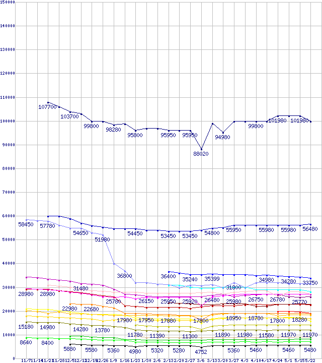 Intel系CPUの最安値推移↑前グラフ↓次グラフ(2008年11月7日〜2009年5月22日)※このグラフは過去のデータも税率5%相当に調整した税込み相当額のグラフです。 税率変更や、総額表示方式導入(2004年4月)の影響は除いています。凡例Core i7-965 Extreme Edition (3.20GHz)Core i7-940 (2.93GHz)Core 2 Quad Q9550S (2.83GHz,L2 6MB×2)Core 2 Quad Q9650 (3.00GHz,L2 6MB×2)Core 2 Quad Q9400S (2.66GHz,L2 3MB×2)Core i7-920 (2.66GHz)Core 2 Duo E8600 (3.33GHz,L2 6MB)Core 2 Quad Q9550 (2.83GHz,L2 6MB×2)Core 2 Quad Q8400S (2.66GHz,L2 2MB×2)Core 2 Quad Q8200S (2.33GHz,L2 2MB×2)Core 2 Quad Q9400 (2.66GHz,L2 3MB×2)Core 2 Quad Q8400 (2.66GHz,L2 2MB×2)Core 2 Quad Q8300 (2.5GHz,L2 2MB×2)Core 2 Duo E8500 (3.16GHz,L2 6MB)Core 2 Duo E8400 (3GHz,L2 6MB)Core 2 Quad Q8200 (2.33GHz,L2 2MB×2)Core 2 Duo E7500 (2.93GHz,L2 3MB)Core 2 Duo E7400 (2.80GHz,L2 3MB)Pentium Dual-Core E5400 (2.7GHz,L2 2MB)Pentium Dual-Core E6300 (2.8GHz,L2 2MB)Pentium Dual-Core E5300 (2.6GHz,L2 2MB)Pentium Dual-Core E5200 (2.5GHz,L2 2MB)Celeron Dual-Core E1500 (2.2GHz)※製品名をクリックすると個別のグラフを表示します※点線部は販売店が確認できなかった、または調査データがないことを示します