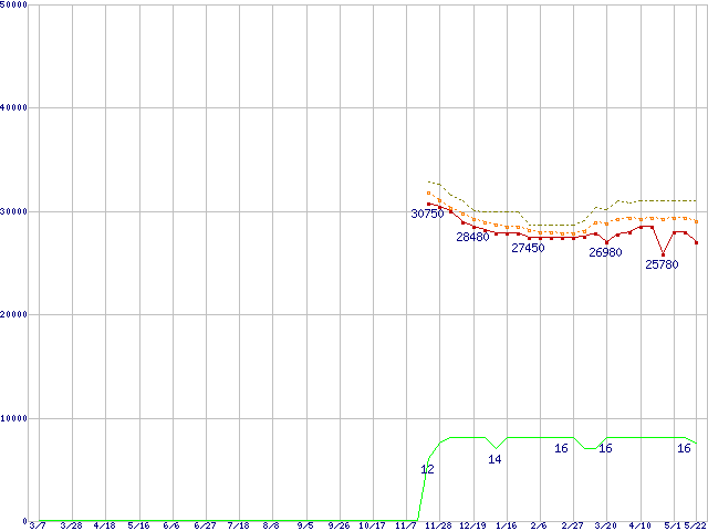 Core i7-920 (2.66GHz)の価格推移↑前グラフ↓次グラフ(2008年3月7日〜2009年5月22日)※このグラフは過去のデータも税率5%相当に調整した税込み相当額のグラフです。 税率変更や、総額表示方式導入(2004年4月)の影響は除いています。●関連グラフCPU主要製品の最安値推移CPU主要製品(最安値2万円〜3万円未満)の最安値推移Intel系CPUの最安値推移LGA1366 (QPI 4.8GT/s,L3キャッシュ8MB,Quad Core,Hyper-Threading)の最安値推移●凡例最安値(点線部は販売店未確認または未調査)平均値最高値ショップ数