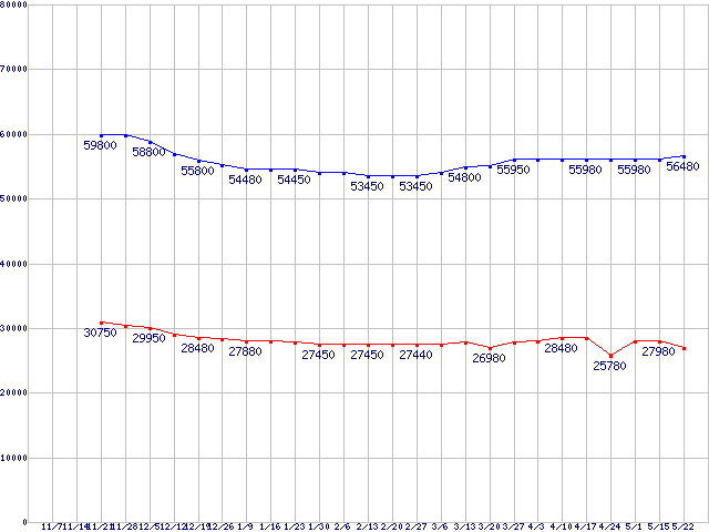| LGA1366 (QPI 4.8GT/s,L3キャッシュ8MB,Quad Core,Hyper-Threading)の最安値推移 |
