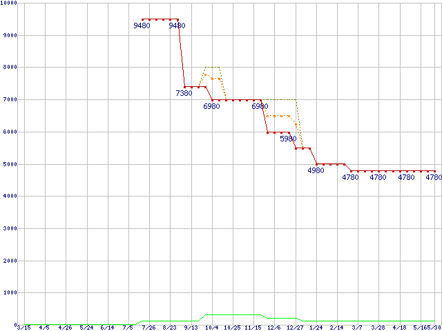 PC3-12800 1GBの価格推移↑前グラフ↓次グラフ(2008年3月15日〜2009年5月30日)※このグラフは過去のデータも税率5%相当に調整した税込み相当額のグラフです。 税率変更や、総額表示方式導入(2004年4月)の影響は除いています。●関連グラフメモリ主要製品の最安値推移1GBモジュールの最安値推移メモリ主要製品(最安値5千円未満)の最安値推移PC3-12800(DDR3-1600) DDR3 SDRAM DIMMの最安値推移●凡例最安値(点線部は販売店未確認または未調査)平均値最高値ショップ数