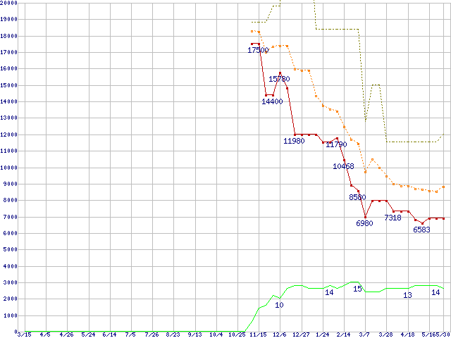 PC3-12800 1GB×3枚組みセットの価格推移↑前グラフ↓次グラフ(2008年3月15日〜2009年5月30日)※このグラフは過去のデータも税率5%相当に調整した税込み相当額のグラフです。 税率変更や、総額表示方式導入(2004年4月)の影響は除いています。●関連グラフメモリ主要製品の最安値推移メモリ主要製品(最安値5千円〜1万円未満)の最安値推移PC3-12800(DDR3-1600) DDR3 SDRAM DIMMの最安値推移●凡例最安値(点線部は販売店未確認または未調査)平均値最高値ショップ数