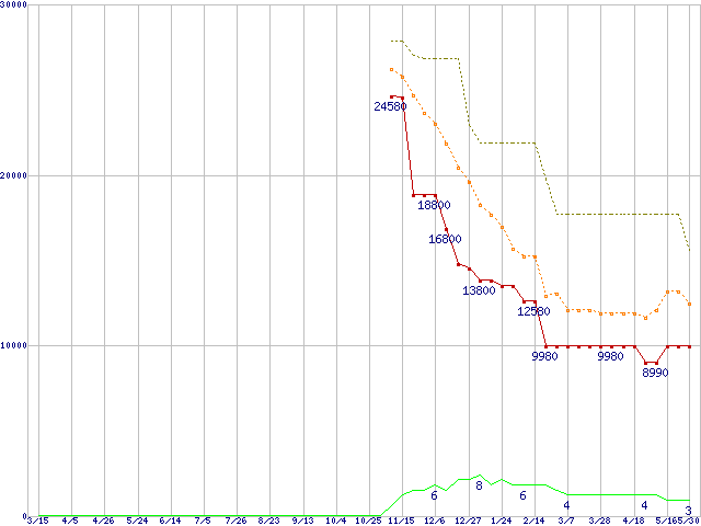 PC3-8500 2GB×3枚組みセットの価格推移↑前グラフ↓次グラフ(2008年3月15日〜2009年5月30日)※このグラフは過去のデータも税率5%相当に調整した税込み相当額のグラフです。 税率変更や、総額表示方式導入(2004年4月)の影響は除いています。●関連グラフメモリ主要製品の最安値推移メモリ主要製品(最安値5千円〜1万円未満)の最安値推移PC3-8500(DDR3-1066) DDR3 SDRAM DIMMの最安値推移●凡例最安値(点線部は販売店未確認または未調査)平均値最高値ショップ数