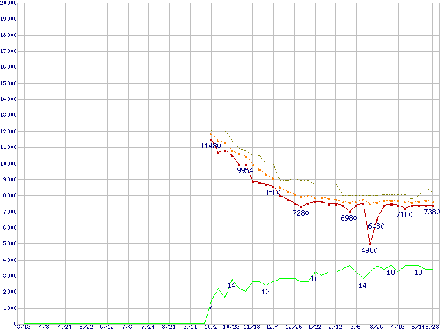 WD10EADS (1TB,32MB)の価格推移↑前グラフ↓次グラフ(2008年3月13日〜2009年5月28日)※このグラフは過去のデータも税率5%相当に調整した税込み相当額のグラフです。 税率変更や、総額表示方式導入(2004年4月)の影響は除いています。●関連グラフHDD/SSD主要製品の最安値推移HDD/SSD主要製品(最安値1万円未満)の最安値推移HDD 1TB〜1.5TB未満の最安値推移WD Caviar Green (3Gb/s)の最安値推移●凡例最安値(点線部は販売店未確認または未調査)平均値最高値ショップ数