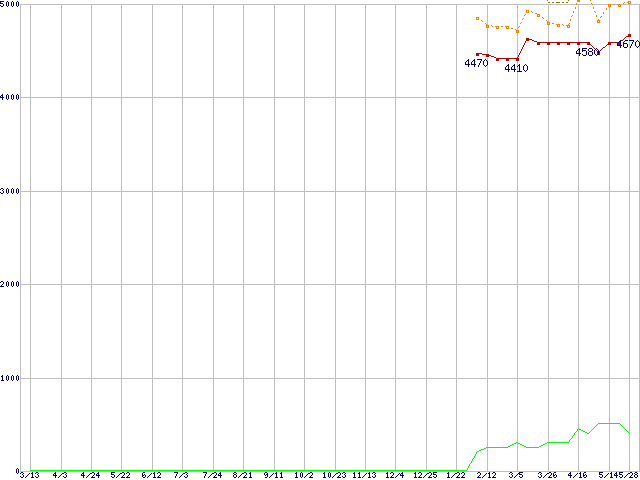 HD502HI (500GB,16MB)の価格推移↑前グラフ↓次グラフ(2008年3月13日〜2009年5月28日)※このグラフは過去のデータも税率5%相当に調整した税込み相当額のグラフです。 税率変更や、総額表示方式導入(2004年4月)の影響は除いています。●関連グラフHDD/SSD主要製品の最安値推移HDD/SSD主要製品(最安値1万円未満)の最安値推移HDD 500〜600GB未満の最安値推移EcoGreen F2 (5400rpm,3Gb/s)の最安値推移●凡例最安値(点線部は販売店未確認または未調査)平均値最高値ショップ数