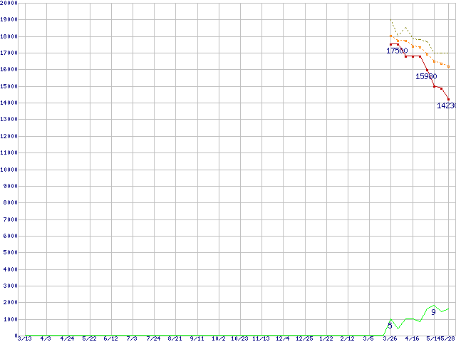 WD15EADS (1.5TB,32MB)の価格推移↑前グラフ↓次グラフ(2008年3月13日〜2009年5月28日)※このグラフは過去のデータも税率5%相当に調整した税込み相当額のグラフです。 税率変更や、総額表示方式導入(2004年4月)の影響は除いています。●関連グラフHDD/SSD主要製品の最安値推移HDD/SSD主要製品(最安値1万円〜1万5千円未満)の最安値推移HDD 1.5TB以上の最安値推移WD Caviar Green (3Gb/s)の最安値推移●凡例最安値(点線部は販売店未確認または未調査)平均値最高値ショップ数