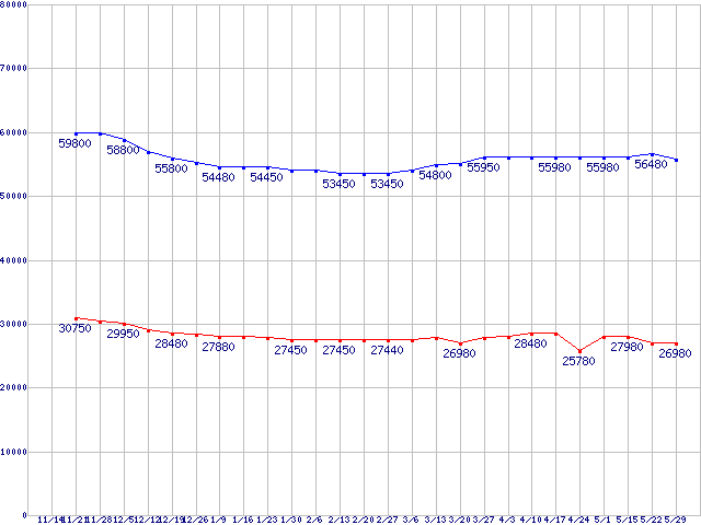 | LGA1366 (QPI 4.8GT/s,L3キャッシュ8MB,Quad Core,Hyper-Threading)の最安値推移 |