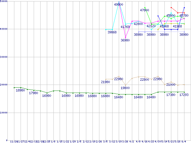 HDD 100〜160GB未満の最安値推移↑前グラフ↓次グラフ(2008年11月20日〜2009年6月4日)※このグラフは過去のデータも税率5%相当に調整した税込み相当額のグラフです。 税率変更や、総額表示方式導入(2004年4月)の影響は除いています。凡例FM-25S2S-128GBF1 (128GB,64MB,MLC)PFZ128GS25SSDR (128GB,64MB,MLC)MMCRE28G5MXP-0VB (128GB,128MB,MLC)PF25S128GSSDV3 (128GB,64MB,MLC)OCZSSD2-1VTX120G (120GB,64MB,MLC)CSSD-SM128NI (128GB,MLC)FTM28GX25H (128GB,64MB,MLC)2.5インチSSD 128GB (128GB,MLC)WD1500HLFS (150.0GB)※製品名をクリックすると個別のグラフを表示します※点線部は販売店が確認できなかった、または調査データがないことを示します
