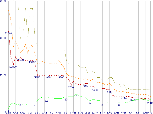PC3-10600 1GB×2枚組みセットの価格推移↑前グラフ↓次グラフ(2008年3月22日〜2009年6月6日)※このグラフは過去のデータも税率5%相当に調整した税込み相当額のグラフです。 税率変更や、総額表示方式導入(2004年4月)の影響は除いています。●関連グラフメモリ主要製品の最安値推移1GBモジュールの最安値推移メモリ主要製品(最安値5千円未満)の最安値推移PC3-10600(DDR3-1333) DDR3 SDRAM DIMMの最安値推移●凡例最安値(点線部は販売店未確認または未調査)平均値最高値ショップ数