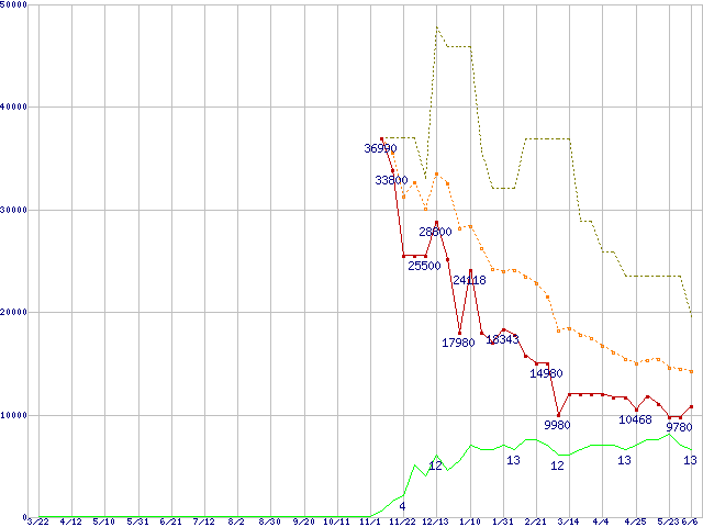 PC3-12800 2GB×3枚組みセットの価格推移↑前グラフ↓次グラフ(2008年3月22日〜2009年6月6日)※このグラフは過去のデータも税率5%相当に調整した税込み相当額のグラフです。 税率変更や、総額表示方式導入(2004年4月)の影響は除いています。●関連グラフメモリ主要製品の最安値推移メモリ主要製品(最安値1万円以上)の最安値推移PC3-12800(DDR3-1600) DDR3 SDRAM DIMMの最安値推移●凡例最安値(点線部は販売店未確認または未調査)平均値最高値ショップ数