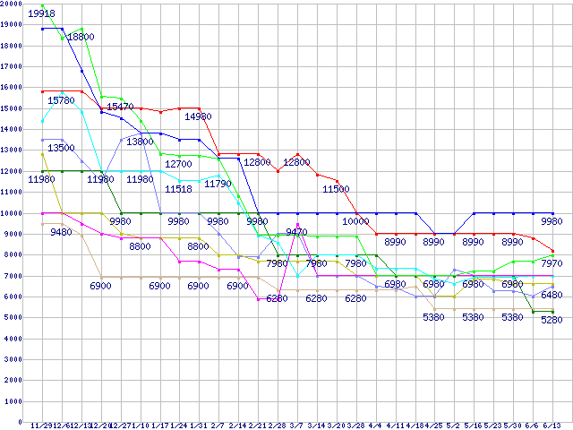 | メモリ主要製品(最安値5千円〜1万円未満)の最安値推移 |
