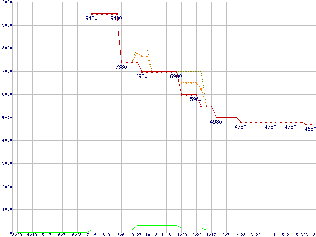 PC3-12800 1GBの価格推移↑前グラフ↓次グラフ(2008年3月29日〜2009年6月13日)※このグラフは過去のデータも税率5%相当に調整した税込み相当額のグラフです。 税率変更や、総額表示方式導入(2004年4月)の影響は除いています。●関連グラフメモリ主要製品の最安値推移1GBモジュールの最安値推移メモリ主要製品(最安値5千円未満)の最安値推移PC3-12800(DDR3-1600) DDR3 SDRAM DIMMの最安値推移●凡例最安値(点線部は販売店未確認または未調査)平均値最高値ショップ数