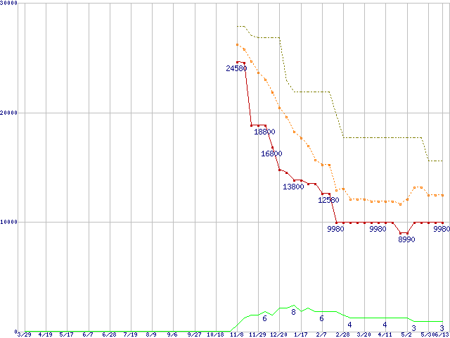 PC3-8500 2GB×3枚組みセットの価格推移↑前グラフ↓次グラフ(2008年3月29日〜2009年6月13日)※このグラフは過去のデータも税率5%相当に調整した税込み相当額のグラフです。 税率変更や、総額表示方式導入(2004年4月)の影響は除いています。●関連グラフメモリ主要製品の最安値推移メモリ主要製品(最安値5千円〜1万円未満)の最安値推移PC3-8500(DDR3-1066) DDR3 SDRAM DIMMの最安値推移●凡例最安値(点線部は販売店未確認または未調査)平均値最高値ショップ数