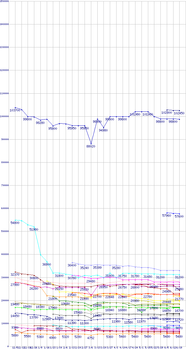 CPU主要製品の最安値推移↑前グラフ↓次グラフ(2008年12月5日〜2009年6月19日)※このグラフは過去のデータも税率5%相当に調整した税込み相当額のグラフです。 税率変更や、総額表示方式導入(2004年4月)の影響は除いています。凡例Core i7-975 Extreme Edition (3.33GHz)Core i7-965 Extreme Edition (3.20GHz)Core i7-950 (3.06GHz)Core 2 Quad Q9550S (2.83GHz,L2 6MB×2)Core 2 Quad Q9650 (3.00GHz,L2 6MB×2)Core i7-920 (2.66GHz)Core 2 Quad Q9400S (2.66GHz,L2 3MB×2)Core 2 Duo E8600 (3.33GHz,L2 6MB)Core 2 Quad Q8400S (2.66GHz,L2 2MB×2)Core 2 Quad Q9550 (2.83GHz,L2 6MB×2)Phenom II X4 955 Black Edition (3.2GHz,L2 512KB×4,L3 6MB,TDP 125W)Core 2 Quad Q8200S (2.33GHz,L2 2MB×2)Core 2 Quad Q9400 (2.66GHz,L2 3MB×2)Phenom II X4 945 (3.0GHz,L2 512KB×4,L3 6MB,TDP 95W)Phenom II X4 905e (2.5GHz,L2 512KB×4,L3 6MB)Phenom II X4 940 Black Edition (3.0GHz,L2 512KB×4,L3 6MB)Core 2 Quad Q8400 (2.66GHz,L2 2MB×2)Core 2 Duo E8500 (3.16GHz,L2 6MB)Core 2 Quad Q8200 (2.33GHz,L2 2MB×2)Phenom II X4 920 (2.8GHz,L2 512KB×4,L3 6MB)Phenom II X4 810 (2.6GHz,L2 512KB×4,L3 4MB)Core 2 Duo E8400 (3GHz,L2 6MB)Core 2 Duo E7600 (3.06GHz,L2 3MB)Core 2 Duo E7500 (2.93GHz,L2 3MB)Phenom II X3 720 Black Edition (2.8GHz,L2 512KB×3,L3 6MB)Phenom II X3 705e (2.5GHz,L2 512KB×3,L3 6MB)Core 2 Duo E7400 (2.80GHz,L2 3MB)Phenom II X2 550 Black Edition (3.1GHz,L2 512KB×2,L3 6MB)Athlon II X2 250 (3.0GHz,L2 1MB×2)Pentium Dual-Core E6300 (2.8GHz,L2 2MB)Pentium Dual-Core E5400 (2.7GHz,L2 2MB)Pentium Dual-Core E5300 (2.6GHz,L2 2MB)Athlon X2 7850 Black Edition (2.8GHz,L2 512KB×2,L3 2MB)Pentium Dual-Core E5200 (2.5GHz,L2 2MB)Athlon X2 7750 (2.7GHz,L2 512KB×2,L3 2MB)Athlon X2 7750 Black Edition (2.7GHz,L2 512KB×2,L3 2MB)Athlon X2 5050e (2.6GHz,L2 512KB×2)Celeron Dual-Core E1600 (2.4GHz)Celeron Dual-Core E1500 (2.2GHz)※製品名をクリックすると個別のグラフを表示します※点線部は販売店が確認できなかった、または調査データがないことを示します