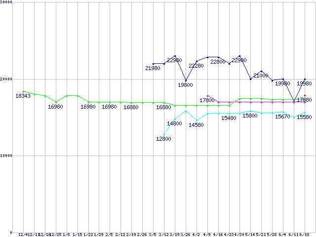 | HDD/SSD主要製品(最安値1万5千円〜2万円未満)の最安値推移 |