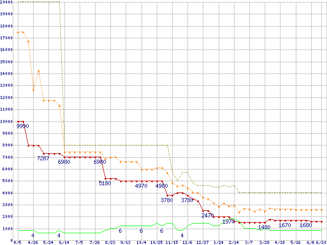 PC3-8500 1GBの価格推移↑前グラフ(2008年4月5日〜2009年6月20日)※このグラフは過去のデータも税率5%相当に調整した税込み相当額のグラフです。 税率変更や、総額表示方式導入(2004年4月)の影響は除いています。●関連グラフメモリ主要製品の最安値推移1GBモジュールの最安値推移メモリ主要製品(最安値5千円未満)の最安値推移PC3-8500(DDR3-1066) DDR3 SDRAM DIMMの最安値推移●凡例最安値(点線部は販売店未確認または未調査)平均値最高値ショップ数