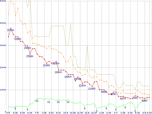 PC3-10600 2GB×2枚組みセットの価格推移↑前グラフ↓次グラフ(2008年4月5日〜2009年6月20日)※このグラフは過去のデータも税率5%相当に調整した税込み相当額のグラフです。 税率変更や、総額表示方式導入(2004年4月)の影響は除いています。●関連グラフメモリ主要製品の最安値推移1GBモジュールの最安値推移メモリ主要製品(最安値5千円〜1万円未満)の最安値推移PC3-10600(DDR3-1333) DDR3 SDRAM DIMMの最安値推移●凡例最安値(点線部は販売店未確認または未調査)平均値最高値ショップ数