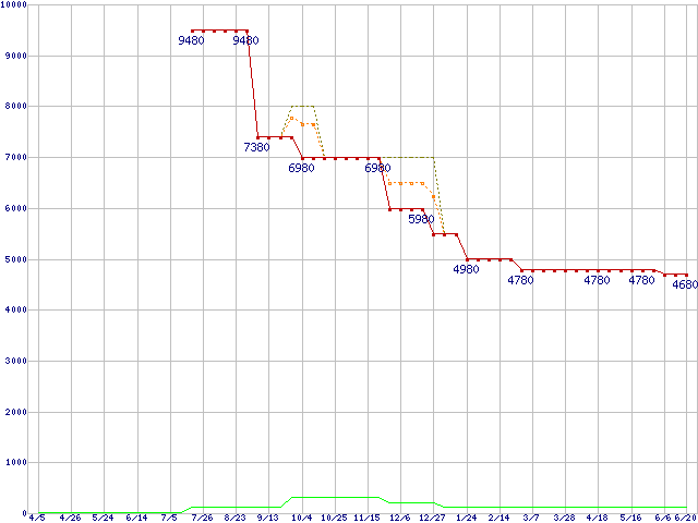 PC3-12800 1GBの価格推移↑前グラフ↓次グラフ(2008年4月5日〜2009年6月20日)※このグラフは過去のデータも税率5%相当に調整した税込み相当額のグラフです。 税率変更や、総額表示方式導入(2004年4月)の影響は除いています。●関連グラフメモリ主要製品の最安値推移1GBモジュールの最安値推移メモリ主要製品(最安値5千円未満)の最安値推移PC3-12800(DDR3-1600) DDR3 SDRAM DIMMの最安値推移●凡例最安値(点線部は販売店未確認または未調査)平均値最高値ショップ数