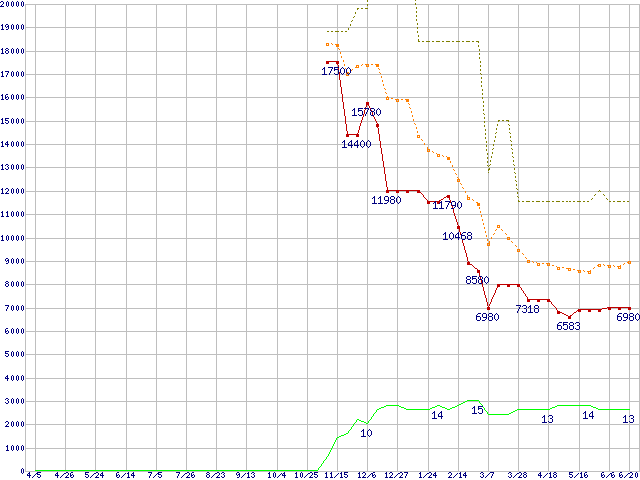 PC3-12800 1GB×3枚組みセットの価格推移↑前グラフ↓次グラフ(2008年4月5日〜2009年6月20日)※このグラフは過去のデータも税率5%相当に調整した税込み相当額のグラフです。 税率変更や、総額表示方式導入(2004年4月)の影響は除いています。●関連グラフメモリ主要製品の最安値推移メモリ主要製品(最安値5千円〜1万円未満)の最安値推移PC3-12800(DDR3-1600) DDR3 SDRAM DIMMの最安値推移●凡例最安値(点線部は販売店未確認または未調査)平均値最高値ショップ数