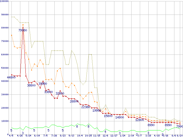 PC3-12800 2GB×2枚組みセットの価格推移↑前グラフ↓次グラフ(2008年4月5日〜2009年6月20日)※このグラフは過去のデータも税率5%相当に調整した税込み相当額のグラフです。 税率変更や、総額表示方式導入(2004年4月)の影響は除いています。●関連グラフメモリ主要製品の最安値推移1GBモジュールの最安値推移メモリ主要製品(最安値5千円〜1万円未満)の最安値推移PC3-12800(DDR3-1600) DDR3 SDRAM DIMMの最安値推移●凡例最安値(点線部は販売店未確認または未調査)平均値最高値ショップ数